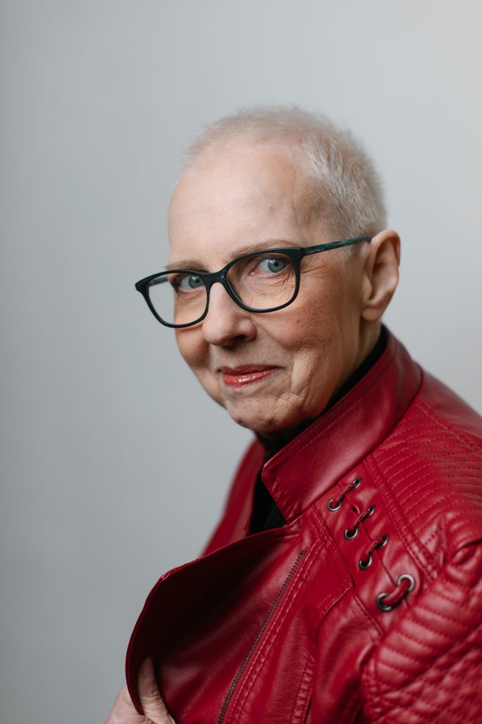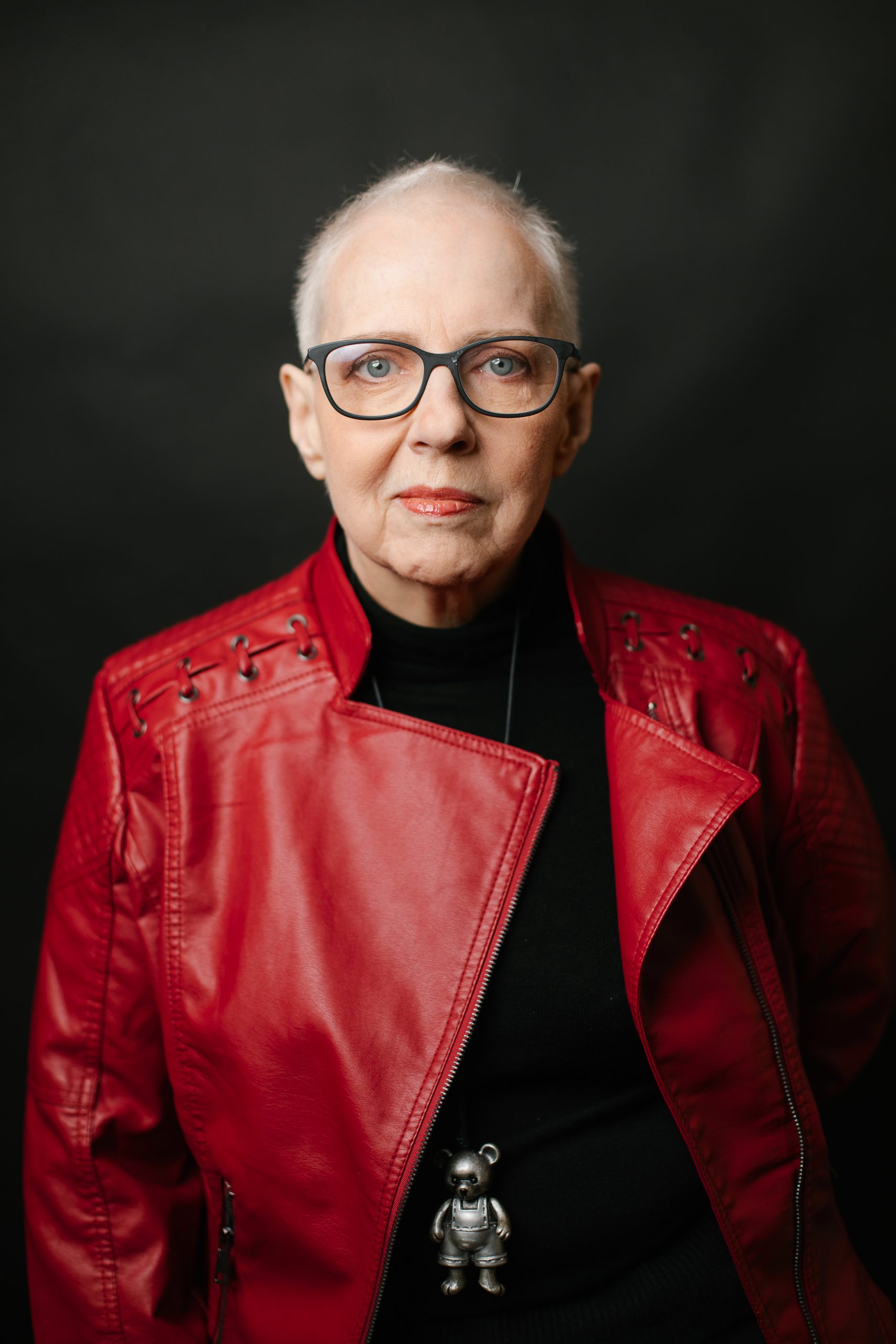 Portrait frontal – dunkel, hoch, rote Lederjacke